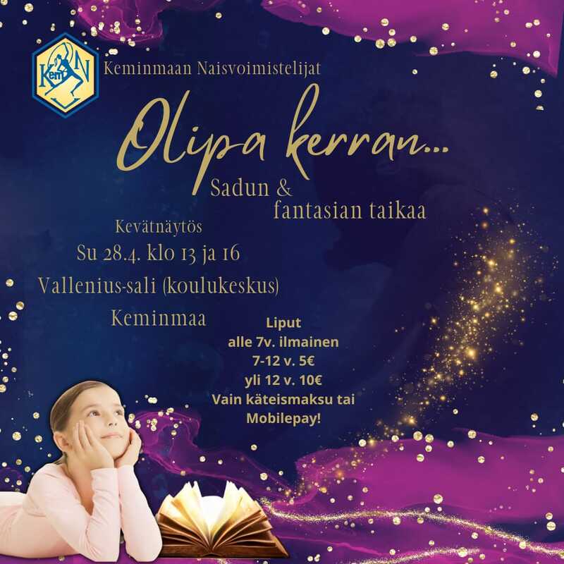 Olipa kerran... Sadun ja fantasian taikaaKeminmaan Naisvoimistelijoiden kevätnäytös 2024 Seuramme kevätnäytökset esitetään Keminmaan koulukeskuksen Vallenius-salissa sunnuntaina 28.4.2024. Näytöksiä on kaksi: klo 13.00 ja klo 16.00. Kaikki ryhmät esiintyvät molemmissa näytöksissä. Liput 10 €, 7–12-vuotiaat 5 € ja alle 7-vuotiaat ilmaiseksi. Lipunmyynti molempiin näytöksiin alkaa alakoulun aulassa näytöspäivänä klo 12.00. Tervetuloa! |