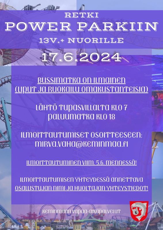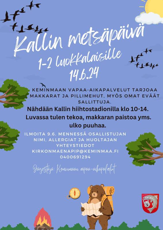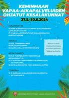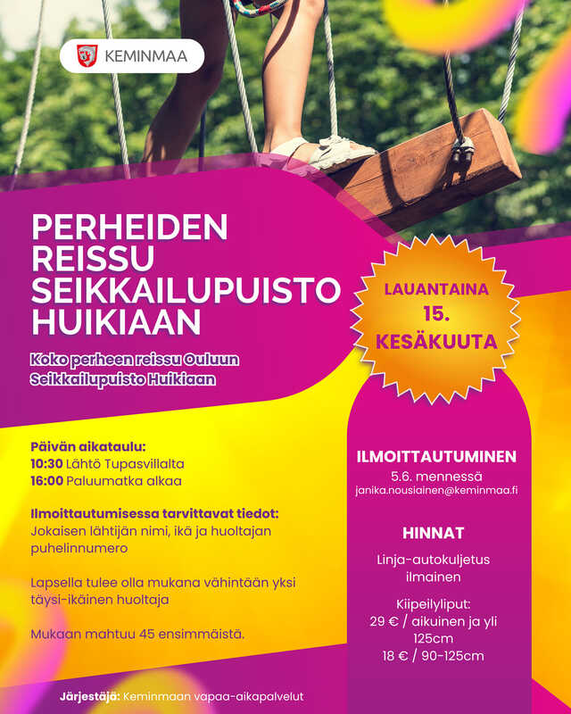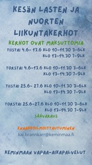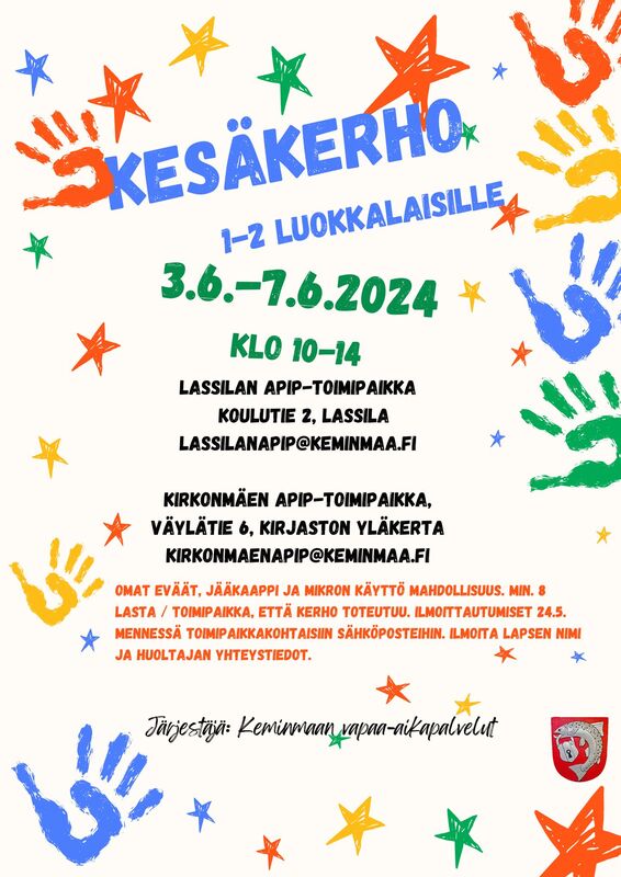 Kesällä monipuolisesti toimintaa kaikenikäisille KeminmaassaMuista ilmoittautua ajoissa kerhoihin ja retkille Vapaa-aikapalveluiden kesäkerhot ja liikuntakerhot lapsille ja nuorille: